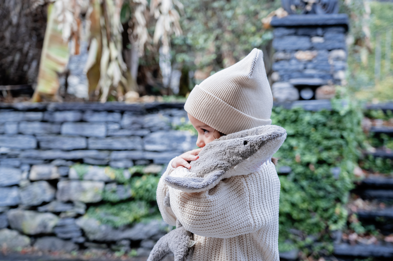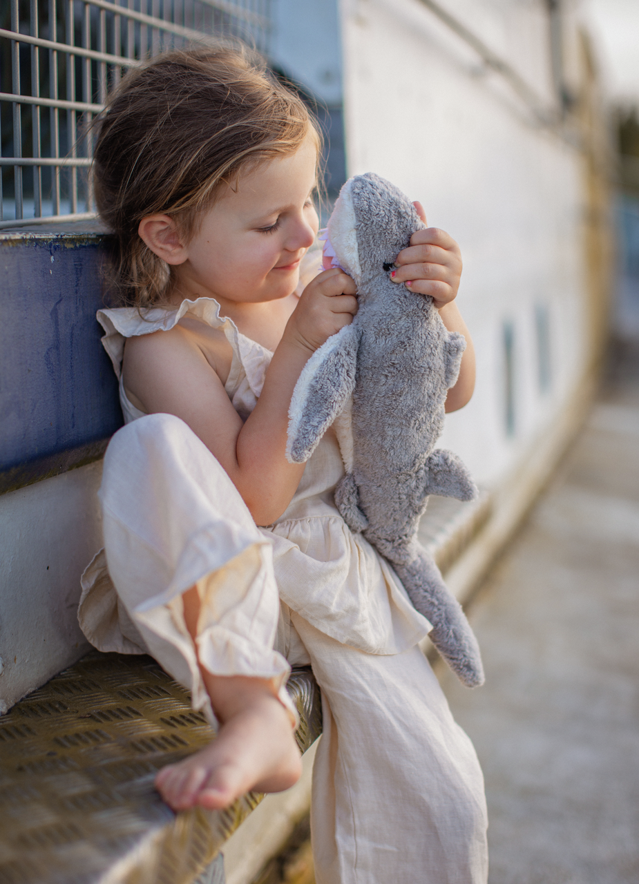 Our Small Shark is more than just a cuddly friend. Lovingly handmade from GOTS-certified organic cotton and filled with pure sheep’s wool, it holds a removable grape seed pillow that gently warms or cools. With its soft shape and curious charm, it’s a comforting companion for little explorers – always ready to snuggle and soothe.