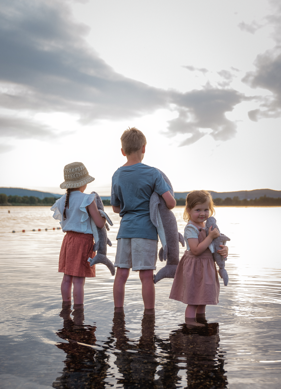 Our Small Shark is more than just a cuddly friend. Lovingly handmade from GOTS-certified organic cotton and filled with pure sheep’s wool, it holds a removable cherry pit pillow that gently warms or cools. With its soft shape and curious charm, it’s a comforting companion for little explorers – always ready to snuggle and soothe.