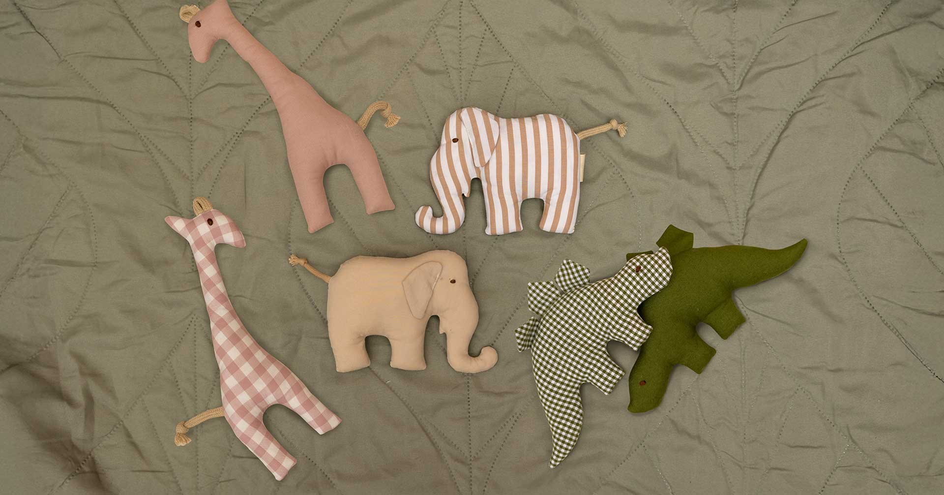 Our grasping toys are made from 100% GOTS-certified cotton and filled with pure cotton, making them suitable even for allergy sufferers. With their handy shape and longer limbs, such as the giraffes neck or the elephants trunk, they are perfect for babies' first gripping attempts.