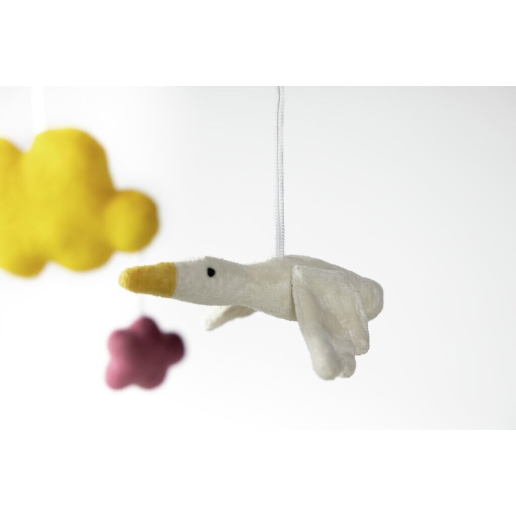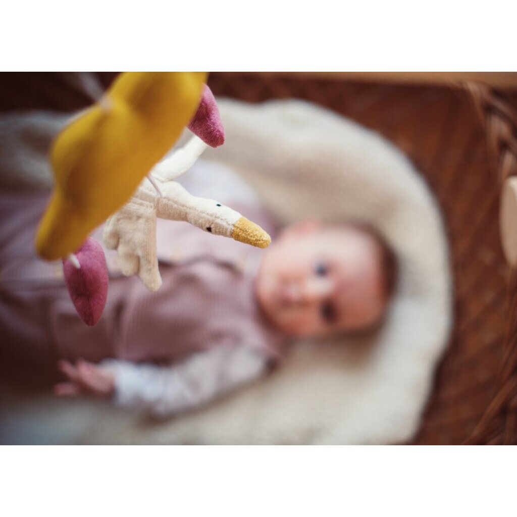The beautiful Sunrise Mobile in a pink colour scheme is a real eye-catcher in any nursery. Thanks to the practical loop, it can easily be hung up anywhere. The little clouds and the goose can also be removed individually and used on a pram chain. The gentle movement of the mobile can help children to calm down and fall asleep better.